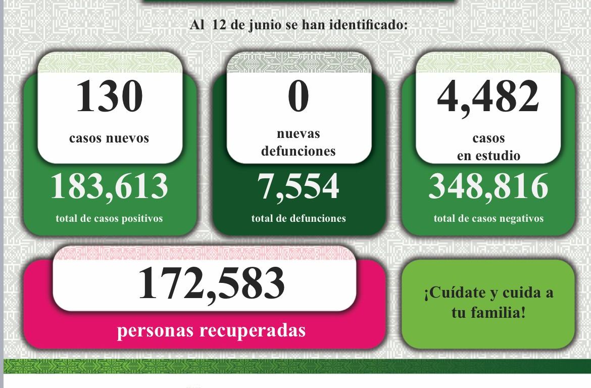 En cuanto al Informe Diario de casos Covid-19, se dan a conocer 130 nuevos contagios confirmados en la Entidad. De esta forma, el Comité Estatal para la Seguridad en Salud y los Servicios de Salud informan que, hasta este 12 de junio, se registran 183 mil 613 casos totales de este padecimiento.