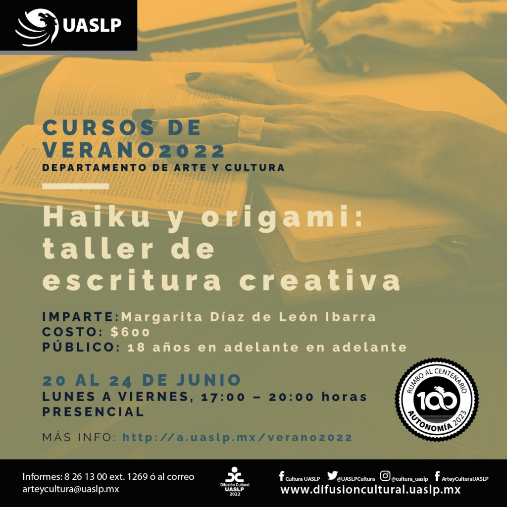 Otro interesante taller es el de “Haiku y Origami: Taller de escritura creativa”, cuya instructora es la doctora Margarita Díaz de León Ibarra. El objetivo de este curso es escribir Haiku, para comprender lo eterno desde la perspectiva del budismo Zen. Este taller se impartirá del 20 de junio al 24 de junio de 17:00 a 20:00 horas, de manera presencial, y cuyo costo es de 600 pesos.