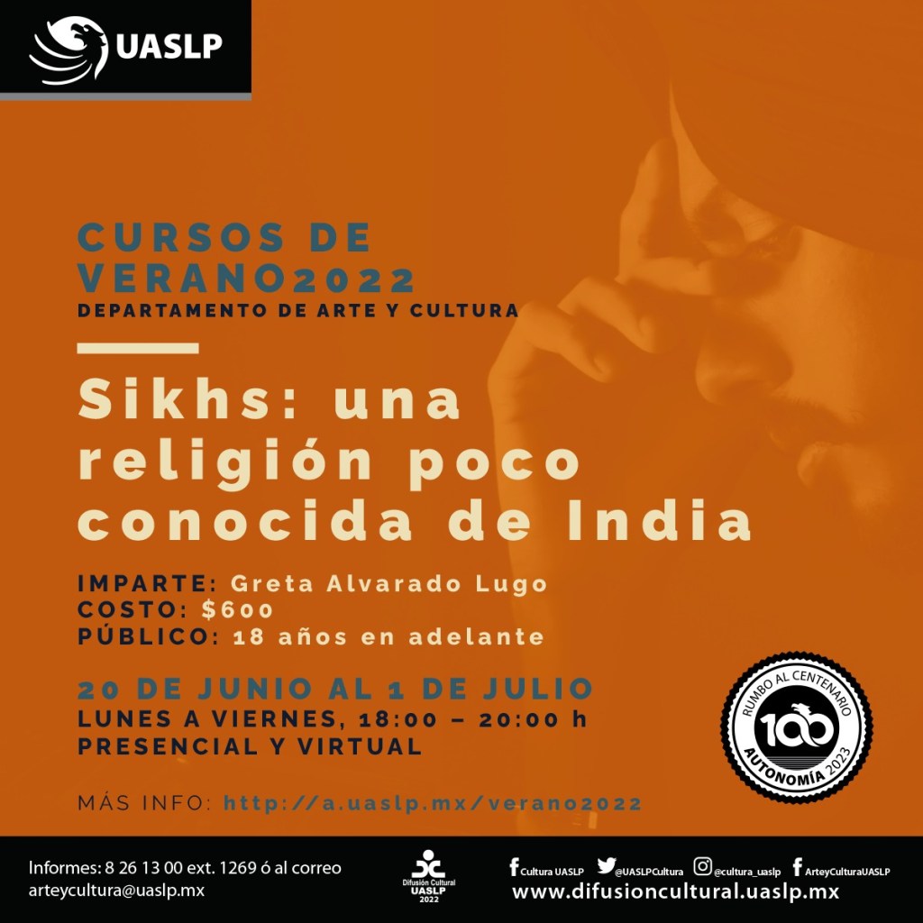 “Sihks: Una religión poco conocida de la India”, es otro taller que tendrá lugar del 20 al 24 de junio de 2022, de lunes a viernes en un horario de 17:00 a 20:00 horas, para dar un total de 15 horas. Sera impartido por la maestra Greta Alvarado Lugo; en este taller se hablará de los orígenes de la religión Sikh, la cual se conformó en el siglo XV en la región india de Pujab. El costo es de este taller es de 600 pesos y se impartirá de manera híbrida.