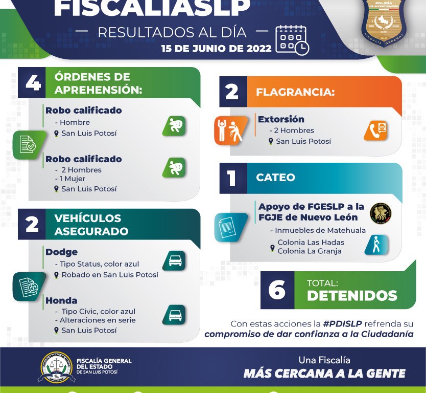 Como parte de las acciones operativas y de investigación, la Fiscalía General del Estado (FGE) detuvo, en las últimas 24 horas, a seis personas relacionadas a varios delitos cometidos en San Luis Potosí.