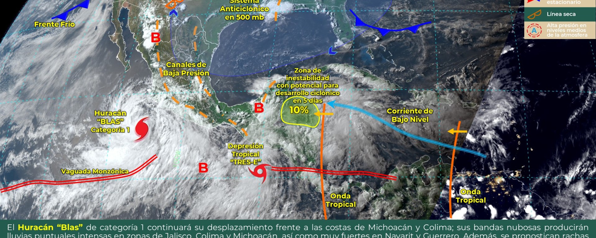 Esta noche y madrugada, el centro del Huracán “Blas” de categoría 1 continuará su desplazamiento frente a las costas de Michoacán y Colima; sus bandas nubosas producirán lluvias puntuales intensas en zonas de Jalisco, Colima y Michoacán, así como muy fuertes en Nayarit y Guerrero. Estas lluvias, originarán un incremento en los niveles de ríos y arroyos, inundaciones y deslaves en dichas entidades. Además, se pronostican rachas de viento de 70 a 80 km/h y oleaje de 3 a 4 metros de altura en las costas de Jalisco, Colima, Michoacán y Guerrero. A las 16:00 horas de hoy, se formó la Depresión Tropical «Tres-E» al sur-sureste de Chiapas, sus bandas nubosas interaccionarán con dos canales de baja presión sobre el oriente y sureste mexicano, provocando lluvias puntuales intensas en Chiapas, muy fuertes en Oaxaca y Tabasco, así como lluvias fuertes en Puebla, Veracruz, Campeche, Yucatán y Quintana Roo. Se prevé que esta depresión tropical se intensifique rápidamente y de origen a una nueva tormenta tropical al sur de El Salvador. Por otra parte, una línea seca en Chihuahua y otro canal de baja presión extendido desde el norte hasta el centro del territorio nacional en combinación con inestabilidad en la atmósfera alta y el aporte de humedad generado por la circulación de «Blas», originará lluvias y chubascos acompañados de descargas eléctricas y posible caída de granizo sobre Sonora, Chihuahua, Durango y Sinaloa.