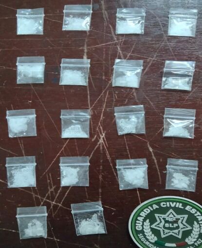 Por su parte, en el Municipio de Axtla de Terrazas, sobre calle Josefa Ortiz de Domínguez, en el ejido Jalpilla, fue detenido Tomas de 35 años de edad, por presunta posesión de 61 dosis de la droga sintética conocida como “cristal” y 17 bolsas con una hierba verde y seca con las características físicas de la marihuana, con un peso aproximado de 72 gramos.