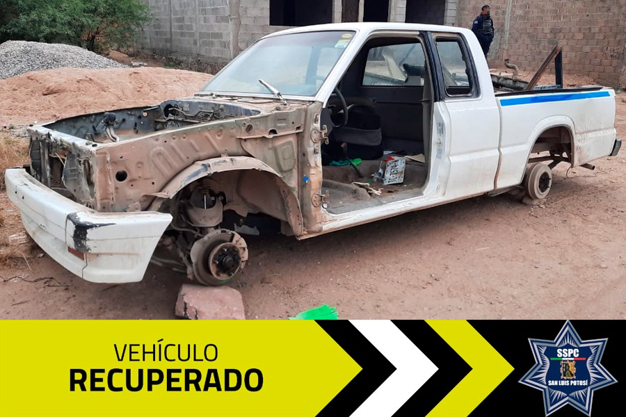 La segunda unidad localizada es una camioneta marca Mazda tipo pick up color blanca que fue visualizada en condiciones de desvalijamiento en la calle de Geranio de la colonia Las Flores. Al acudir a verificar el reporte, los agentes municipales confirmaron el faltante de piezas como llantas, puertas y cofre.