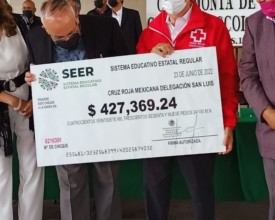 Como resultado de la campaña de educación social emprendida por el Sistema Educativo Estatal Regular de San Luis Potosí, entre directivos, docentes, alumnas y alumnos de 470 escuelas oficiales y particulares de los diferentes niveles educativos de la capital, la comunidad SEER entregó a la delegación de la Cruz Roja Mexicana la cantidad de 427 mil 369 pesos con 24 centavos, producto de la Colecta 2021-2022.