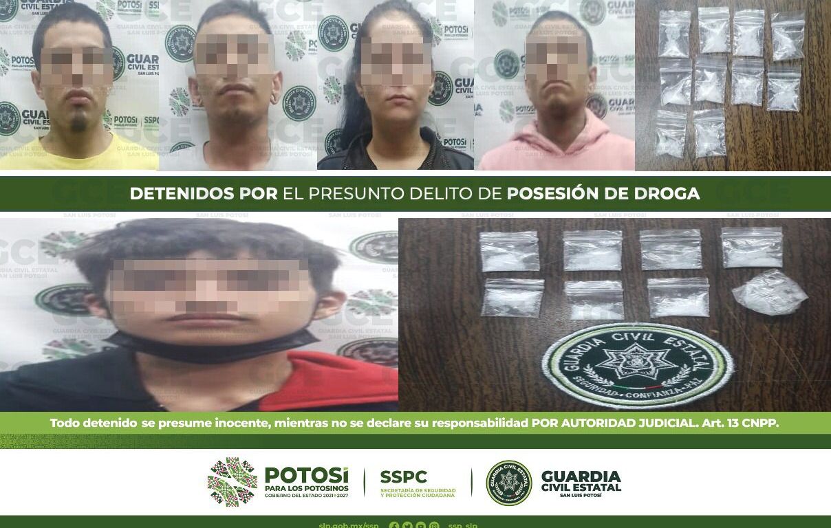 Derivado de los diferentes dispositivos implementados a efecto de preservar la paz en la capital del Estado e inhibir la comisión de hechos delictivos, Policías de la Guardia Civil Estatal (GCE) detuvieron a cinco personas por el presunto delito de posesión de droga.