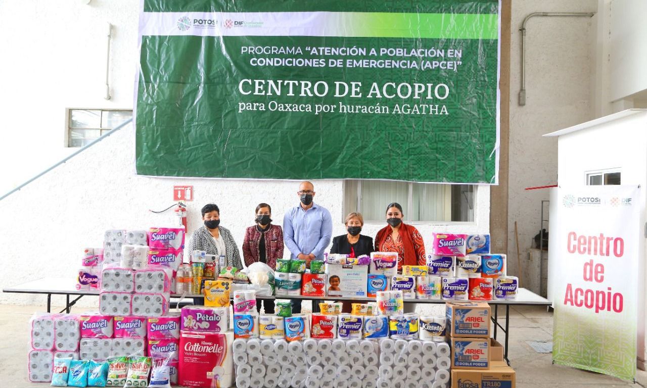 En un acto de solidaridad con el pueblo de Oaxaca, luego de los daños y afectaciones que a la población provocó el huracán Agatha, el Sistema Estatal para el Desarrollo Integral de la Familia (DIF) de San Luis Potosí instaló un centro de acopio para recolectar artículos de primera necesidad y limpieza para enviarlos a las personas en condición vulnerable de esta Entidad.