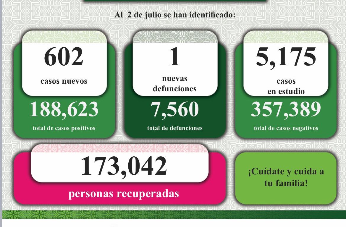 Se dan a conocer 602 nuevos contagios confirmados en la entidad en el Informe Diario de casos Covid-19. De esta forma, el Comité Estatal para la Seguridad en Salud y los Servicios de Salud informan que, se registran mil 161 casos en este mes y un total de 188 mil 623 casos totales de este padecimiento en el Estado.