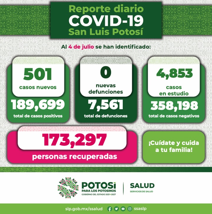 En el Informe Diario de casos Covid-19, se dan a conocer 501 nuevos contagios confirmados en la Entidad. El Comité Estatal para la Seguridad en Salud y los Servicios de Salud informan que se registran 189 mil 699 casos totales de este padecimiento.