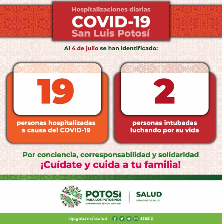 El Comité Estatal de Vacunación contra Covid-19 da a conocer que para este lunes 4 de julio la ocupación de camas para brindar atención a personas enfermas del virus es del 2.8 por ciento, registrándose 19 personas internadas, dos requieren de respiración asistida.