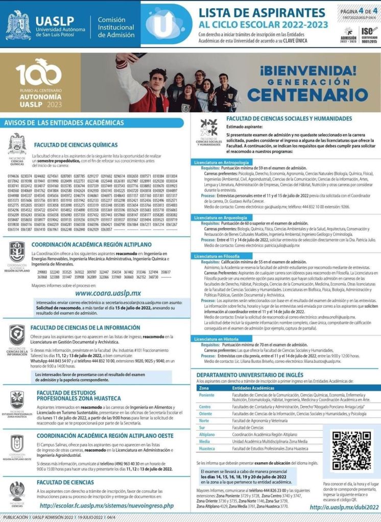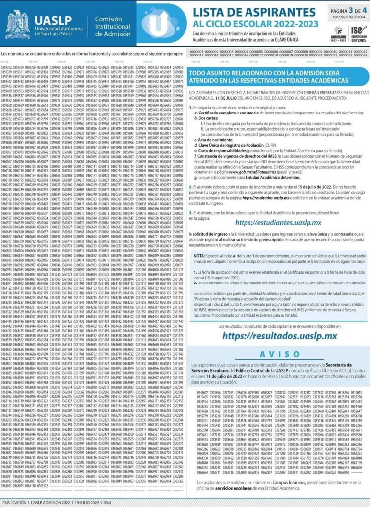 Destacados, UASLPResultados del Examen de Admisión de la UASLP 2022-2023 Listados: portal https://resultados.uaslp.mx. Comparte esto: Compartir en X (Se abre en una ventana nueva) X Comparte en Facebook (Se abre en una ventana nueva) Facebook Me gusta Cargando...
