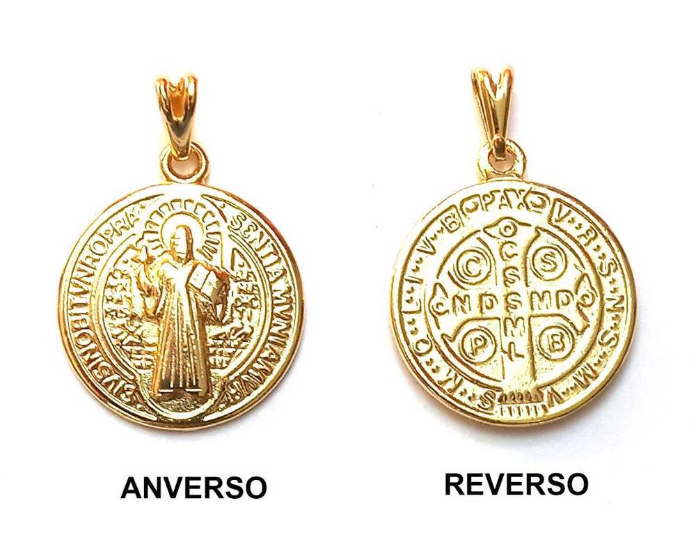 A ambos lados del santo dice: “Crux Sancti Patris Benedicti” (Cruz del Santo Padre Benito). Se puede ver también una copa de la cual sale una víbora y un cuervo. De manera circular aparece la oración: “Eius in óbitu nostro preséntia muniamur” (A la hora de nuestra muerte seamos protegidos por su presencia). En la parte inferior central se lee: “Ex. S. M. Cassino MDCCCLXXX” (Del Santo Monte Cassino 1880).