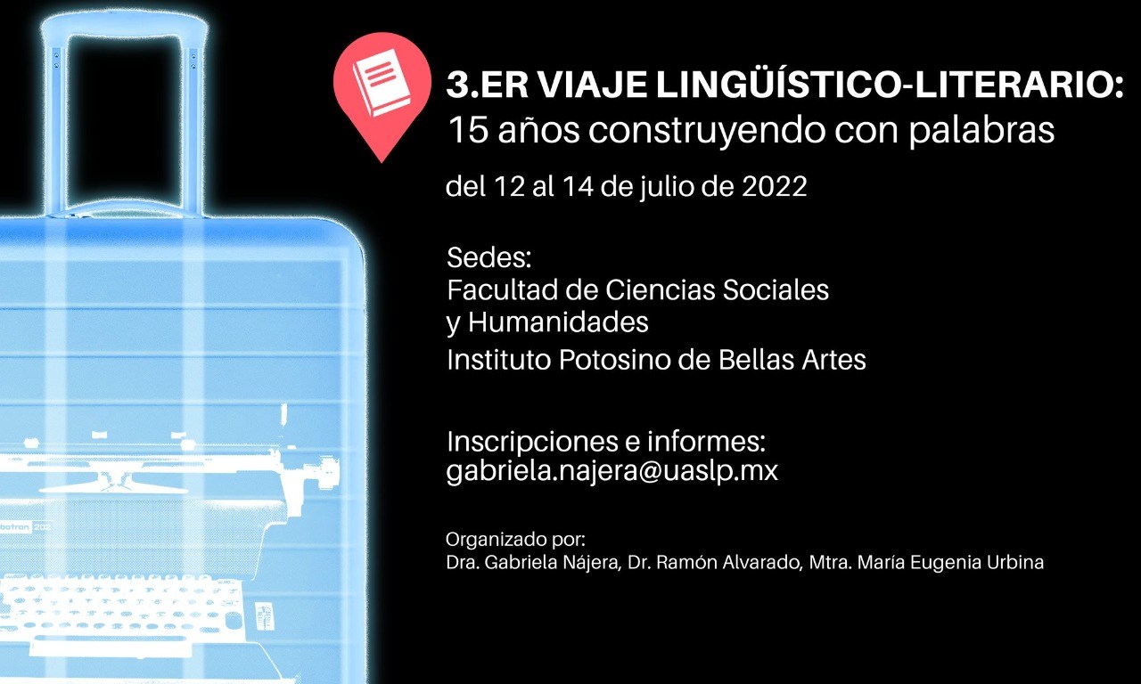 La Facultad de Ciencias Sociales y Humanidades de la Universidad Autónoma de San Luis Potosí, a través de la Licenciatura en Lengua y Literatura Hispanoamericanas, invita al Tercer Viaje Lingüístico y Literario, “15 años construyendo con palabras”, el cual comprende un ciclo de conferencias y mesas redondas que tendrá lugar en dos sedes, como la Facultad de Ciencias Sociales y Humanidades y en el Instituto Potosino de Bellas Artes.