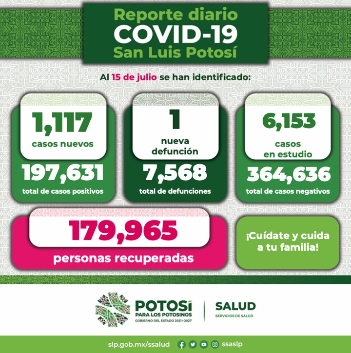 En cuanto al Informe Diario de casos Covid-19, se dan a conocer 1 mil 117 nuevos contagios confirmados en la Entidad. De esta forma, el Comité Estatal para la Seguridad en Salud y los Servicios de Salud informan que, hasta este 15 de julio, se registran 197 mil 631 casos totales de este padecimiento.
