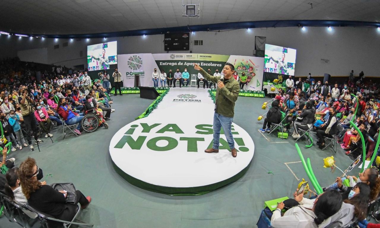 La entrega de útiles escolares, mochilas y zapatos inició en Soledad de Graciano Sánchez el viernes y el sábado en San Luis Potosí, donde más de 135 mil estudiantes de primaria y secundaria serán beneficiados con mochilas, útiles escolares y zapatos. Este mismo mes, la entrega se extenderá a todos los municipios del estado.