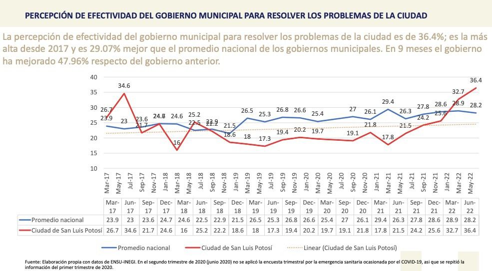 La administración municipal que encabeza el alcalde Enrique Galindo Ceballos en la ciudad de San Luis Potosí es reconocida por los buenos resultados en la eficacia del gobierno, ya que se colocó como la quinta capital del país mejor evaluada, de acuerdo con la Encuesta Nacional de Seguridad Urbana del Inegi.