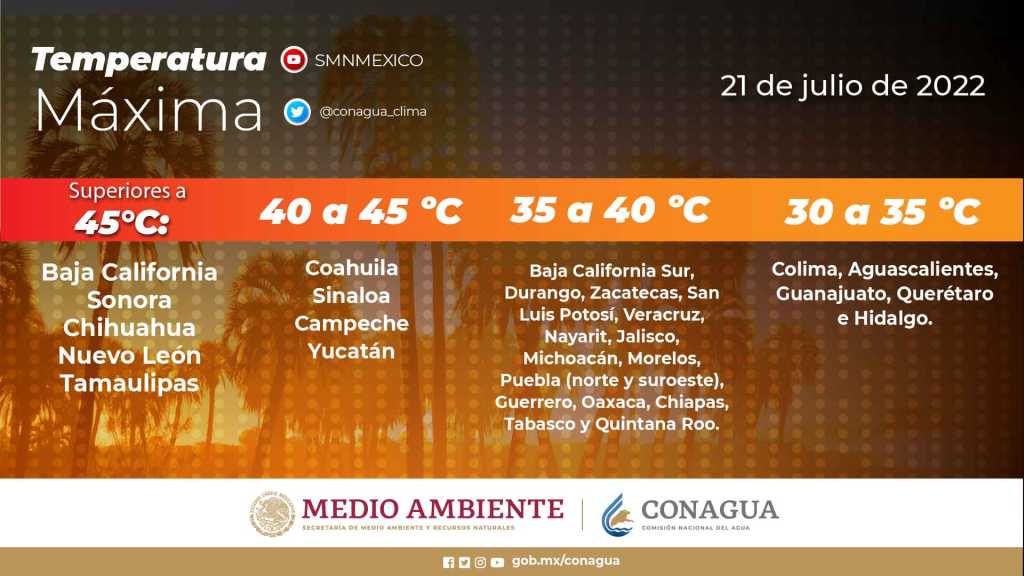 La onda tropical Núm. 14 recorrerá las costas del Pacífico Central Mexicano e interaccionará con un canal de baja presión, lo que ocasionará lluvias puntuales muy fuertes acompañadas de descargas eléctricas y posible caída de granizo en Nayarit, Jalisco, Colima, Michoacán y Guerrero. La onda tropical Núm. 15 se desplazará sobre el sur de la Península de Yucatán e interaccionará con otro canal de baja presión sobre el occidente de dicha región, originando probabilidad de chubascos en Quintana Roo, acompañados de lluvias puntuales fuertes en el sureste de México. Por su parte, el monzón mexicano producirá lluvias puntuales muy fuertes acompañadas de descargas eléctricas y posible caída de granizo en zonas de Sonora, Chihuahua, Durango y Sinaloa. Finalmente, se pronostican temperaturas diurnas cálidas a calurosas en gran parte de la República Mexicana, así como temperaturas muy calurosas, superiores a los 40 °C en Coahuila, Sinaloa, Campeche y Yucatán, y con valores máximos extremadamente calurosos, por arriba de los 45 °C, en zonas de Baja California, Sonora, Chihuahua, Nuevo León y Tamaulipas.