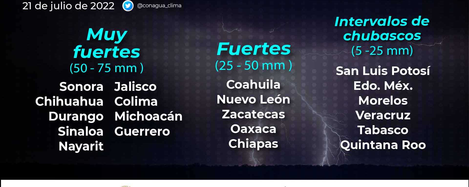 Lluvias fuertes con puntuales muy fuertes (50 a 75 mm): Sonora, Chihuahua, Durango, Sinaloa, Nayarit, Jalisco, Colima, Michoacán y Guerrero.