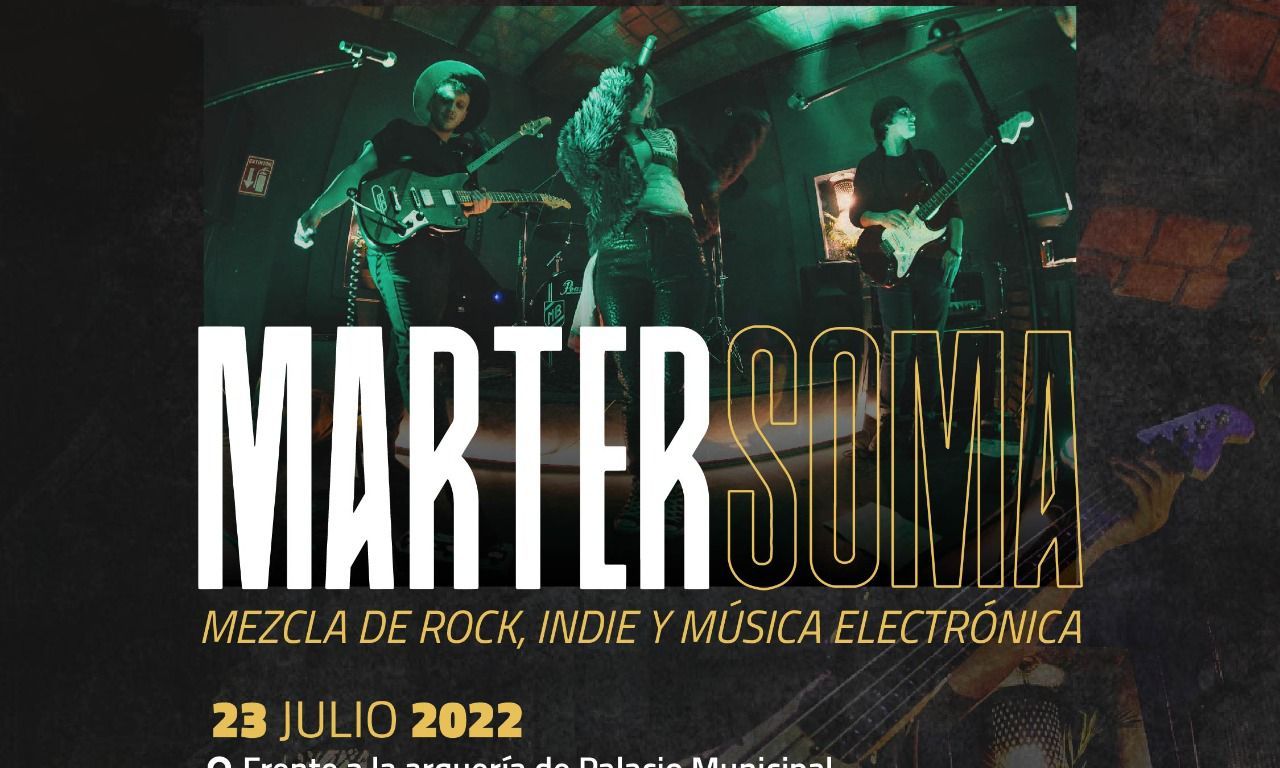 Una vez que hayas visitado las exposiciones montadas en las Galerías del Centro Cultural Palacio Municipal, este sábado 23 de julio, quédate porque frente a la Arquería de Palacio Municipal se presentará la banda potosina Marter Soma, la cual destaca por ser una mezcla de rock, indie y música electrónica, una banda que se formó por integrantes de bandas potosinas independientes.