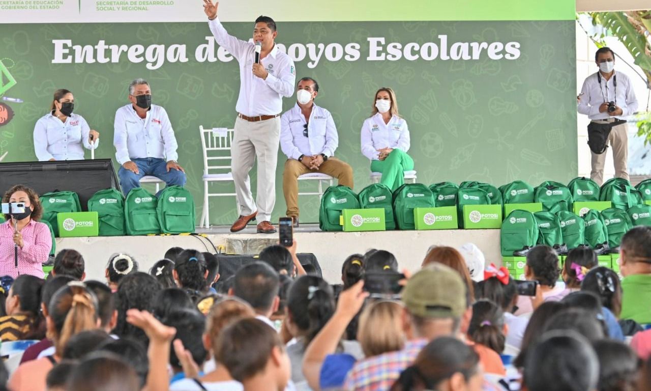 Cumpliendo a cabalidad con el compromiso contraído con estudiantes y familias de zona Huasteca de apoyar decididamente a la educación, este viernes el Gobernador del Estado Ricardo Gallardo Cardona entregó apoyos escolares en el municipio de Tamuín.