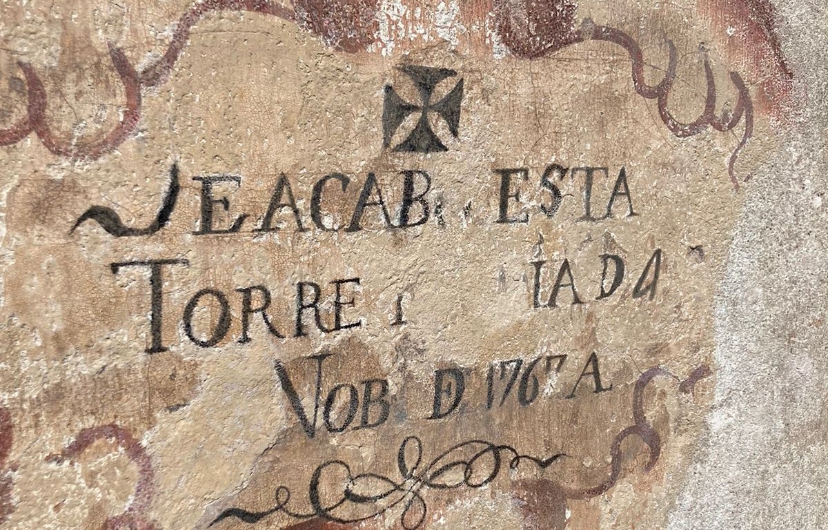 Algunas letras desaparecieron y por instrucciones del INAH no se reintegraron. A este proyecto se le puso el nombre de Cartela, porque así se le conoce al pequeño mural que hace alusión a un papel desdoblado, en este caso se marca la fecha en que se terminó de construir la torre, 24 de noviembre de 1767.