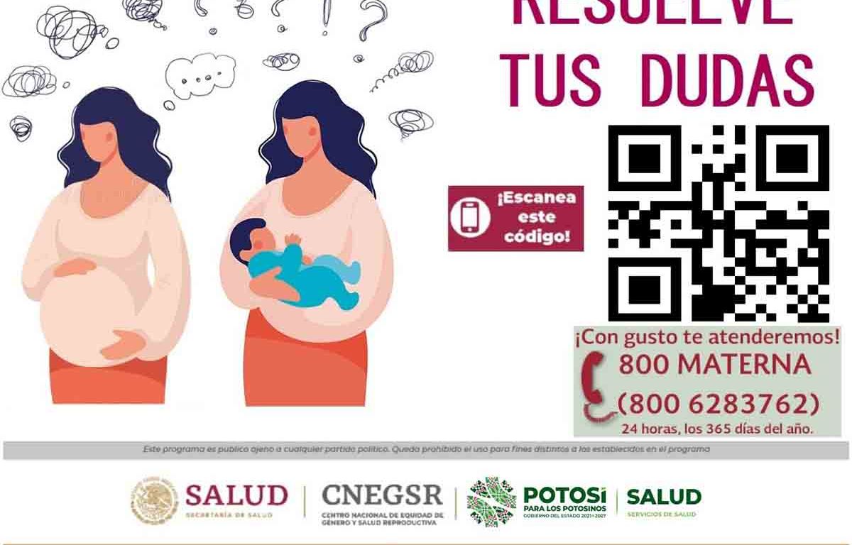 Para coadyuvar a la reducción de la morbilidad y mortalidad materna y perinatal como ha sido la instrucción del Gobernador del Estado Ricardo Gallardo Cardona, el Programa de Salud Materna y Perinatal de los Servicios de Salud, ha enfatizado acciones comunitarias como la implementación de la línea telefónica 800 MATERNA (8006283762), que funciona las 24 horas los 365 días del año y es operada por personal de salud experto para apoyo a las mujeres embarazadas y familiares.