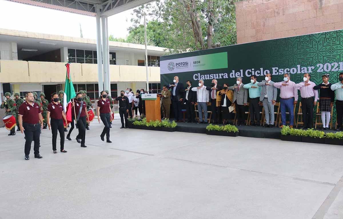 En un acto cívico en el emblemático edificio del internado Damián Carmona, donde se rindió informe de los resultados obtenidos en materia educativa, el titular de la SEGE expuso que fue un cierre de ciclo escolar atípico y diferente para las y los integrantes de la comunidad educativa; sin embargo, reconoció que se llevaron a cabo acciones, programas y capacitaciones como lo instruyó el Gobernador del Estado, con lo que se hizo frente a los retos a favor de las niñas, niños y adolescentes potosinos.