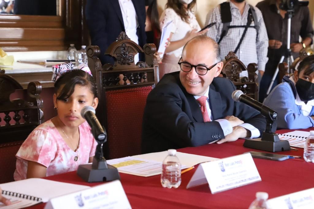 El presidente municipal de San Luis Potosí, Enrique Galindo Ceballos, tomó protesta simbólica al “Cabildo Infantil 2022”, en el que consideró un ejercicio que busca el fortalecimiento de los valores cívicos y la cultura democrática de las y los jóvenes estudiantes: “Hoy creo que es un antes y un después, es un acto en el que damos apertura total a niñas, niños y adolescentes, para que sean parte del gobierno”, expuso el alcalde.