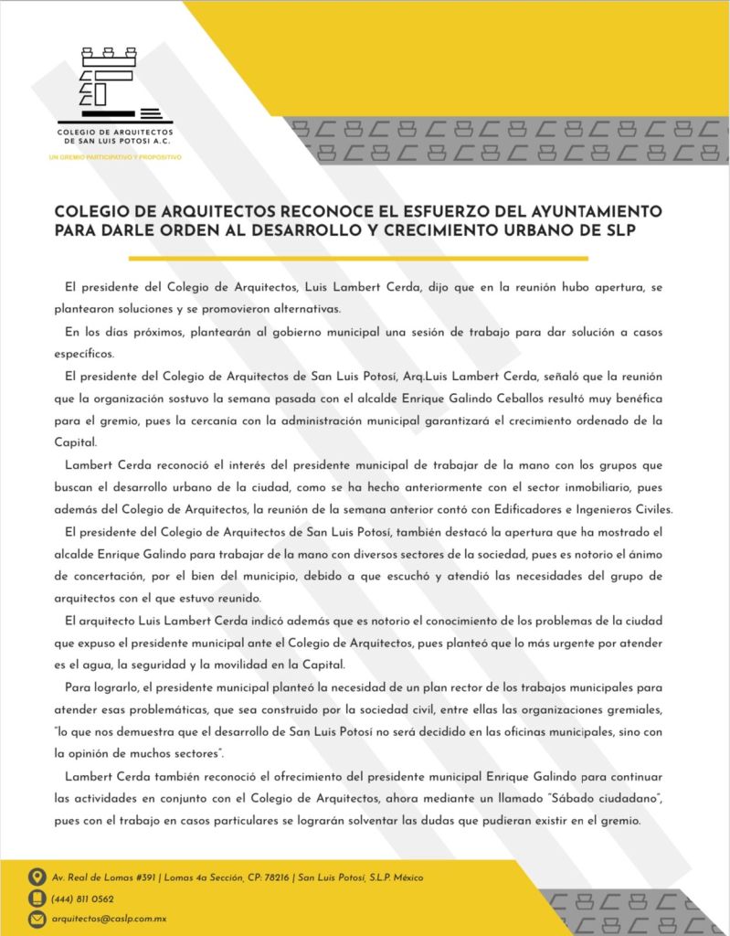 El presidente del Colegio de Arquitectos de San Luis Potosí, Arq.Luis Lambert Cerda, señaló que la reunión que la organización sostuvo la semana pasada con el alcalde Enrique Galindo Ceballos resultó muy benéfica para el gremio, pues la cercanía con la administración municipal garantizará el crecimiento ordenado de la Capital.