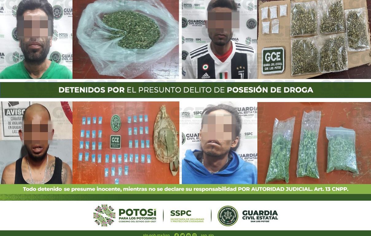 Como resultado de la estrategia integral de seguridad para inhibir el consumo, distribución y venta de drogas en la Entidad potosina, en diferentes acciones, elementos de la Guardia Civil Estatal detuvieron a 9 personas y aseguraron 88 dosis de estupefacientes.