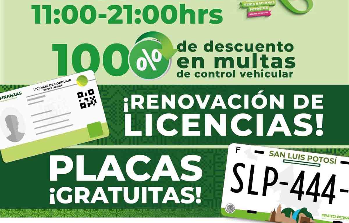 Atendiendo la instrucción del Gobernador de San Luis Potosí, Ricardo Gallardo Cardona de ofrecer una feria de servicios a las y los potosinos, la Secretaría de Finanzas de Gobierno del Estado (Sefin) instalará un módulo de atención en las instalaciones de la Feria Nacional Potosina (Fenapo) en un horario de 11:00 a 21:00 horas, donde realizará trámites de renovación de licencias, placas de circulación y diversos pagos que actualmente se aplican en las oficinas recaudadoras.
