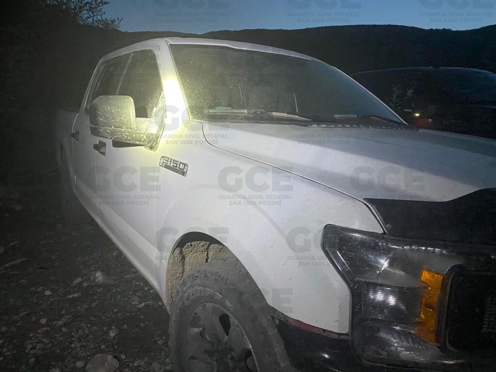 Al exterior de la vivienda, sobre el arroyo vehicular de camino de terracería se halló una camioneta marca Ford tipo pickup en color gris, sin neumáticos, montada entre piedras y estructuras metálicas.