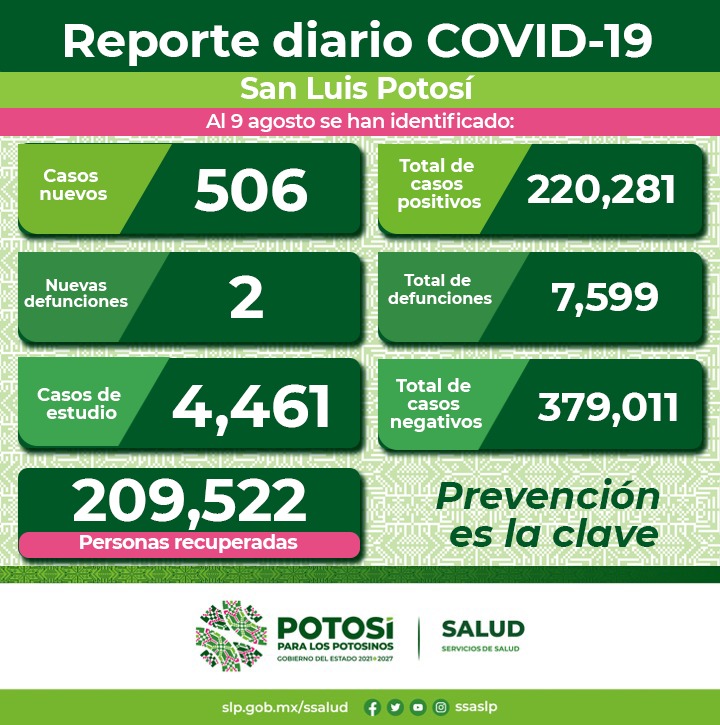En la Jurisdicción Sanitaria I se detectaron 444 de los nuevos casos; 18, en la Jurisdicción Sanitaria II de Matehuala; ocho, en la Jurisdicción Sanitaria III de Villa de Pozos; 23, en la Jurisdicción Sanitaria IV de Rioverde; seis, en la Jurisdicción Sanitaria V de Ciudad Valles; uno, en la Jurisdicción Sanitaria VI de Tamazunchale; uno, en la Jurisdicción Sanitaria VII de Tancanhuitz; y cinco, nuevos contagios en personas residentes de otra entidad.