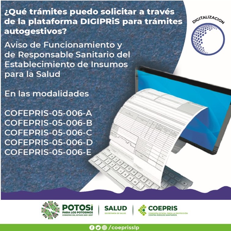 El trámite de Aviso de Funcionamiento es el segundo trámite sanitario de mayor demanda, este puede realizarse de manera presencial en los siete Centros Integrales de Servicios, ubicados al interior del estado, en las instalaciones de las siete Jurisdicciones Sanitarias y para la capital potosina y Soledad de Graciano Sánchez, el Centro Integral se encuentra ubicado en las instalaciones de COEPRIS en 5 de Mayo No. 1485, Barrio de San Miguelito o bien, puede realizar el trámite de manera digital a través de la plataforma DIGIPRIS para lo cual se requiere firma electrónica del SAT e ingresar a: https://digipris.cofepris.gob.mx