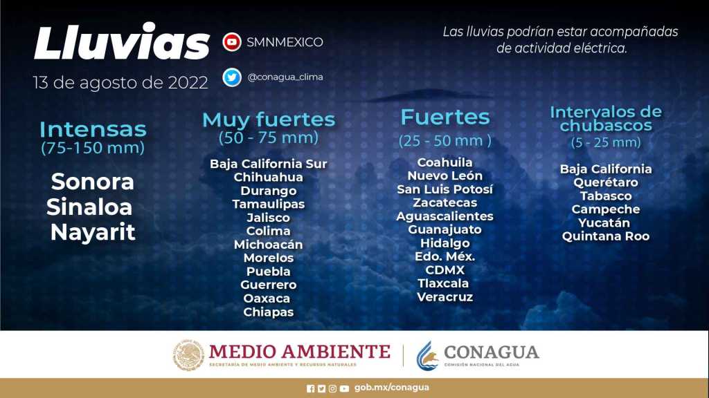 Pronóstico de lluvias para hoy 13 de agosto de 2022: