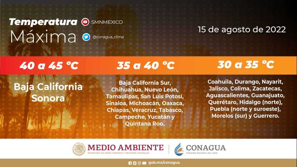 Temperaturas máximas de 35 a 40 °C: Baja California Sur, Chihuahua, Nuevo León, Tamaulipas, San Luis Potosí, Sinaloa, Michoacán, Oaxaca, Chiapas, Veracruz, Tabasco, Campeche, Yucatán y Quintana Roo.