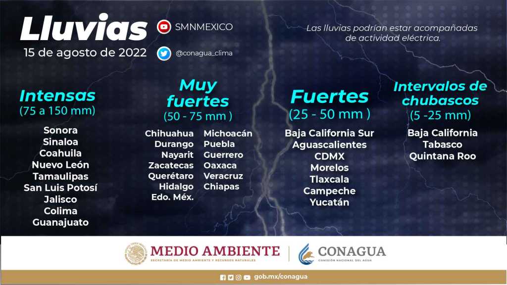 Intervalos de chubascos con lluvias puntuales fuertes (25 a 50 mm): Baja California Sur, Aguascalientes, Ciudad de México, Morelos, Tlaxcala, Campeche y Yucatán.