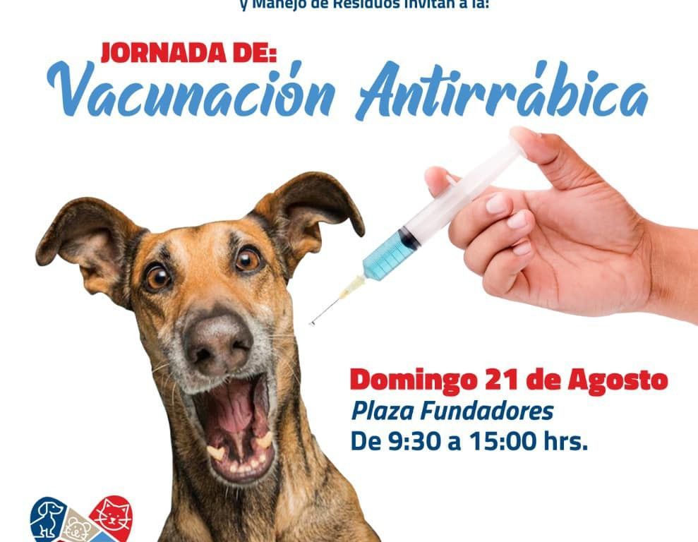El programa municipal “De corazón mi mascota” llegará a la Plaza de Los Fundadores este domingo 21 de agosto, a partir de las 9:30 horas, con la campaña de vacunación antirrábica para perros y gatos, en la que se aplicarán 2 mil dosis gratuitas.