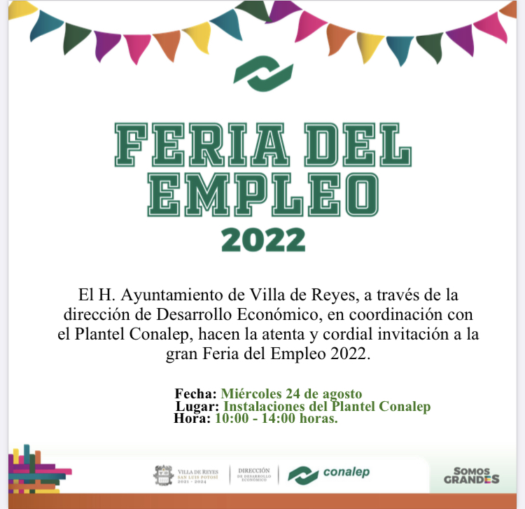 Como parte de las acciones y facilidades que brinda el H. Ayuntamiento de Villa de Reyes encabezado por la alcaldesa, Érika Irazema Briones Pérez y la relación con el sector empresarial, se llevará la Feria del Empleo en las instalaciones del plantel Conalep no.176 de este municipio.