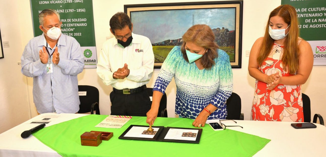 La alcaldesa de Soledad de Graciano Sánchez, Leonor Noyola Cervantes encabezó el evento de cancelación de la estampilla postal “Heroínas de la Independencia”, Leona Vicario (1789-1842), Manuela Sáenz (1797-1856) realizado este lunes en la Casa de la Cultura de este municipio.