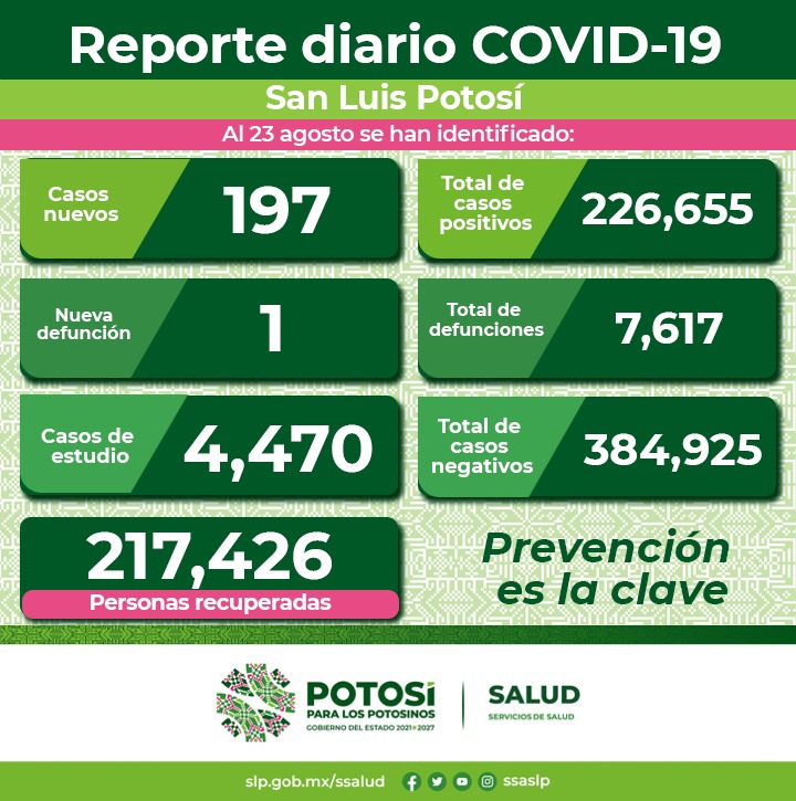 En la Jurisdicción Sanitaria I se detectaron 174 de los nuevos casos; cuatro, en la Jurisdicción Sanitaria II de Matehuala; nueve, en la Jurisdicción Sanitaria III de Villa de Pozos; dos, en la Jurisdicción Sanitaria IV de Rioverde; siete, en la Jurisdicción Sanitaria V de Ciudad Valles; y un nuevo contagio en personas residentes de otra entidad; en las jurisdicciones sanitarias VI de Tamazunchale y VII de Tancanhuitz no se registraron nuevos casos.
