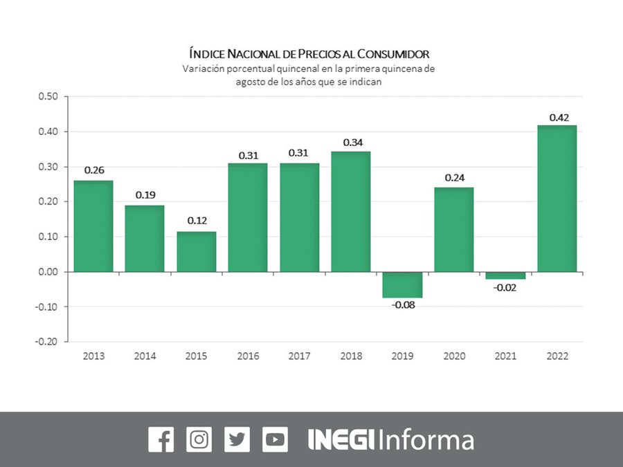 En la primera quincena de agosto de 2022, el Índice Nacional de Precios al Consumidor