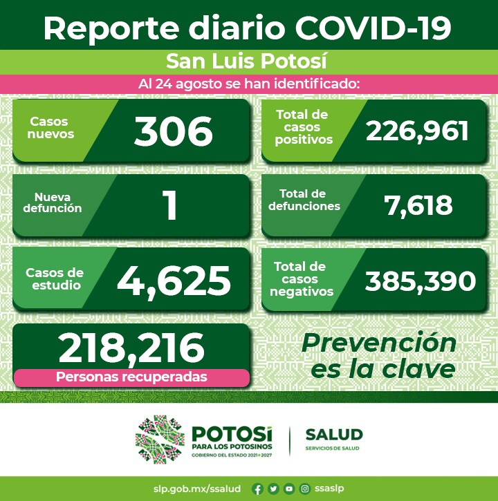 Hasta este martes 24 de agosto, en San Luis Potosí se han emitido 218 mil 216 altas del total de los casos confirmados por Covid, sin embargo la pandemia no ha terminado, por lo que Comité Estatal para la Seguridad en Salud y los Servicios de Salud enfatizan en continuar implementado las medidas precautorias para fortalecer y cuidar las vías respiratorias y evitar contagios por Covid.