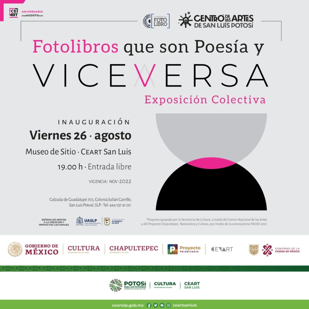 El proximo 26 de agosto a partir de las 19:00 hrs., se llevará a cabo la inauguración de la Exposición Colectiva, Fotolibros que son Poesía y Viceversa, en el Museo de Sitio del Centro de las Artes, misma que permanecerá hasta el seis de noviembre. La invitación a la exposición es abierta al público en general.