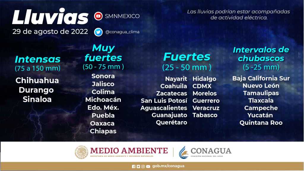 Intervalos de chubascos con lluvias puntuales fuertes (25 a 50 mm): Nayarit, Coahuila, Zacatecas, San Luis Potosí, Aguascalientes, Guanajuato, Querétaro, Hidalgo, Ciudad de México, Morelos, Guerrero, Veracruz y Tabasco.