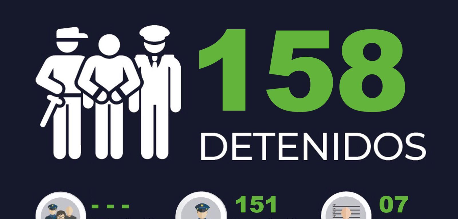 En diferentes operativos de seguridad implementados en todo el territorio potosino, agentes de la Guardia Civil Estatal (GCE) detuvieron a 158 personas: 151 fueron puestas a disposición de la Fiscalía General del Estado por la presunta comisión de diversos delitos, y 7 de estas fueron presentadas ante el Juez Cívico Calificador por faltas administrativas.
