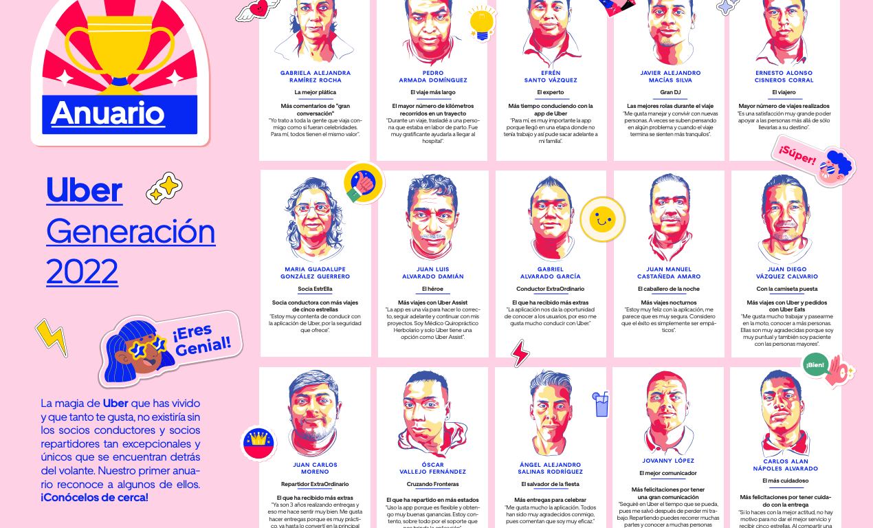 Uber anunció el lanzamiento de su anuario 2022, proyecto que celebra a algunos de los socios conductores y socios repartidores registrados en la plataforma más destacados en México, gracias a su esfuerzo y dedicación por brindar un gran servicio a los usuarios que usan la app de Uber y Uber Eats.