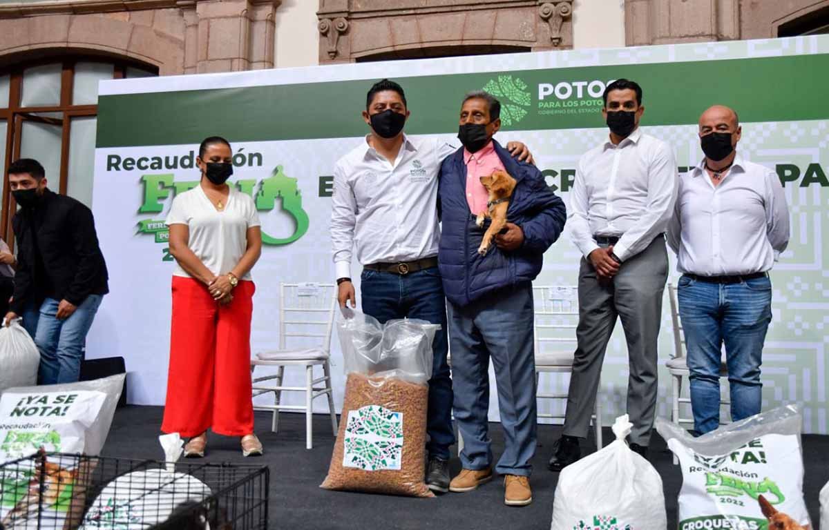 - El Gobernador Ricardo Gallardo entregó cerca de 15 toneladas de alimento para mascotas que fueron donadas por las y los potosinos a cambio de boletos para acudir a conciertos de la Fenapo