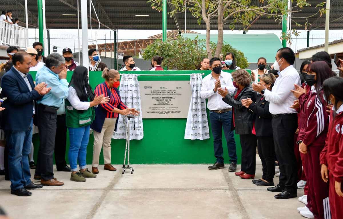 Para dar continuidad a las acciones del Gobierno del cambio de reforzar la educación de jóvenes alumnos de manera integral a través del fomento al deporte y para que nadie se quede atrás, el Gobernador de San Luis Potosí entregó una cancha deportiva en la Escuela Secundaria Técnica número 79, ubicada en la colonia Cactus en Soledad de Graciano Sánchez, así como obras adicionales para que cientos de alumnas y alumnos accedan a instalaciones dignas y de calidad.