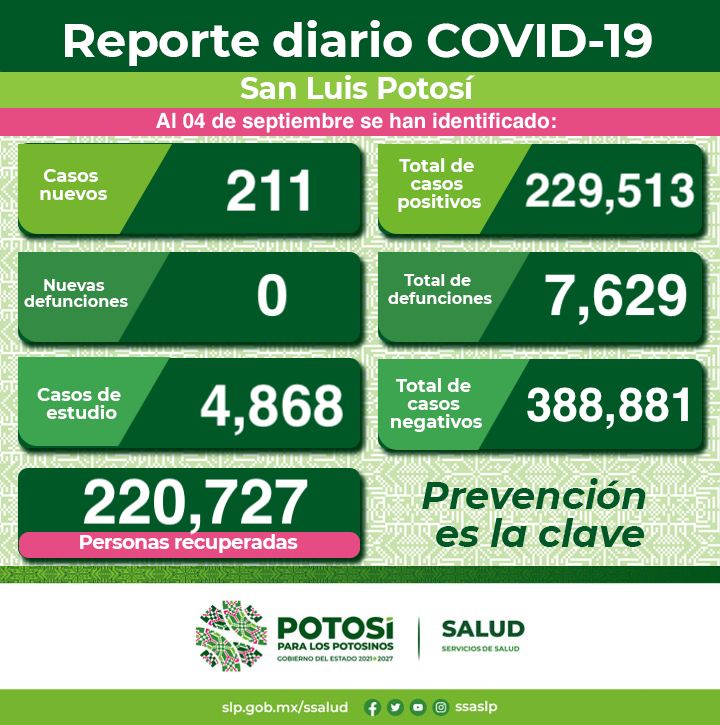 Se dan a conocer en el Informe Diario de casos Covid-19, 211 nuevos contagios en la Entidad, teniendo un acumulado de 229 mil 513 casos totales de este padecimiento. Y por segundo día consecutivo no se registran decesos en el mes de septiembre, manteniéndose el número de defunciones en 7 mil 629.