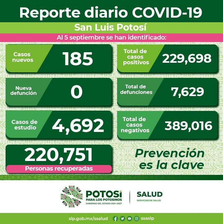 En cuanto a los casos Covid-19 en el Estado, se dan a conocer 185 nuevos contagios confirmados. De esta forma, el Comité Estatal para la Seguridad en Salud y los Servicios de Salud informan que, hasta este 5 de septiembre, se registran 229 mil 698 casos totales de este padecimiento.
